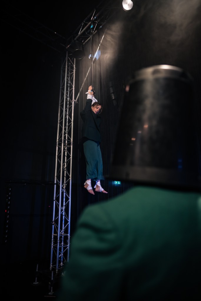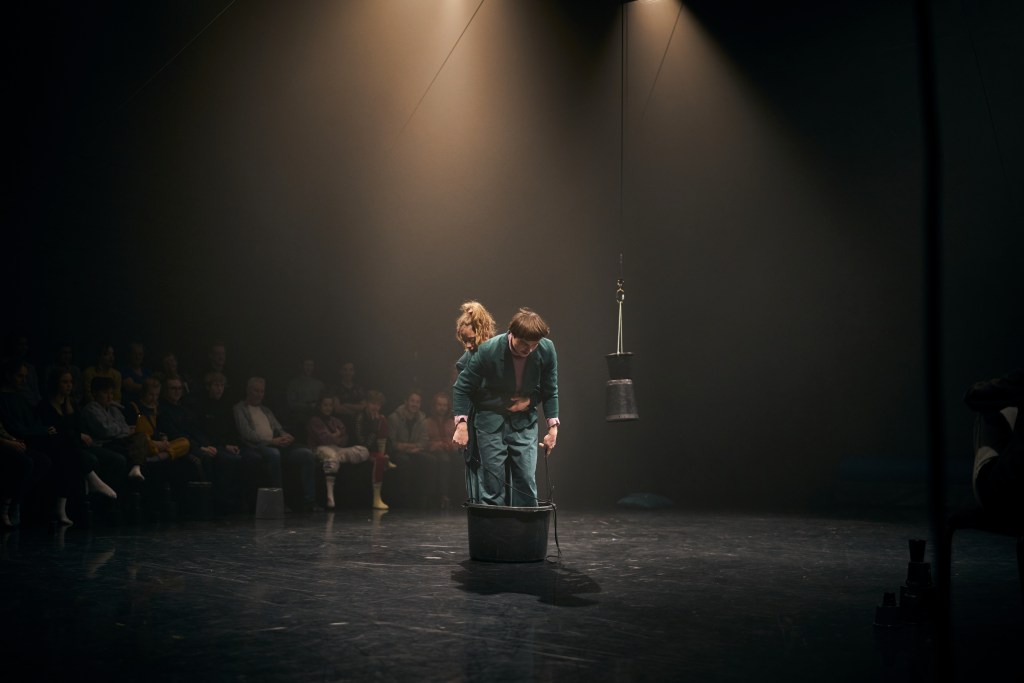O U T” is the title of Half In company’s first creation. This piece began in 2019 in Stockholm as a meeting of two people, a duo trapeze, buckets, and space. It’s a 50 minutes performance, created for indoor.. Première was the 7th of October 2024 with Riksteatern in Umeå.