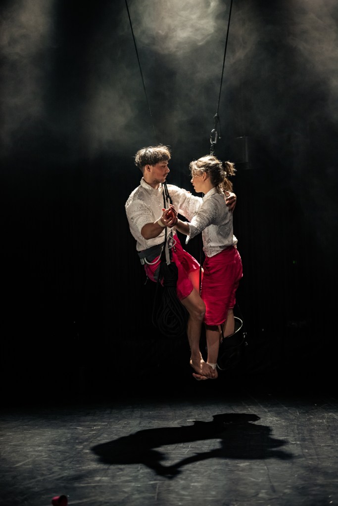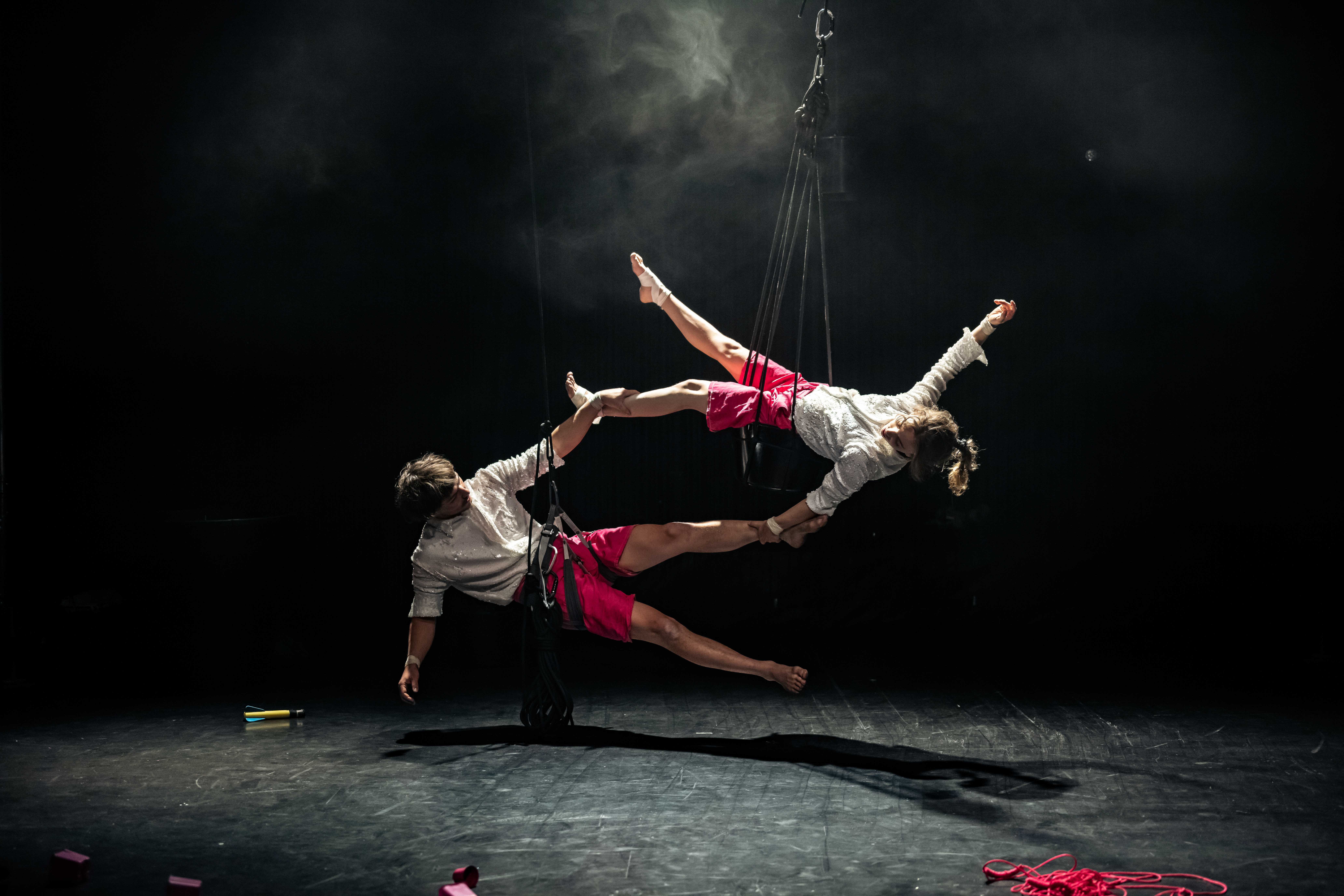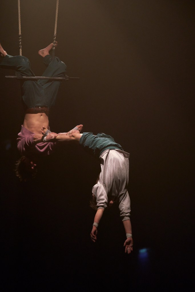 Suddenly, disco balls fall from the roof and the game is to find a way to remove the buckets. Finding their way of communicating, they dance through madness and start flying on the trapeze. This acrobatic piece will make you wonder what flying feels like, and trust will feel different.