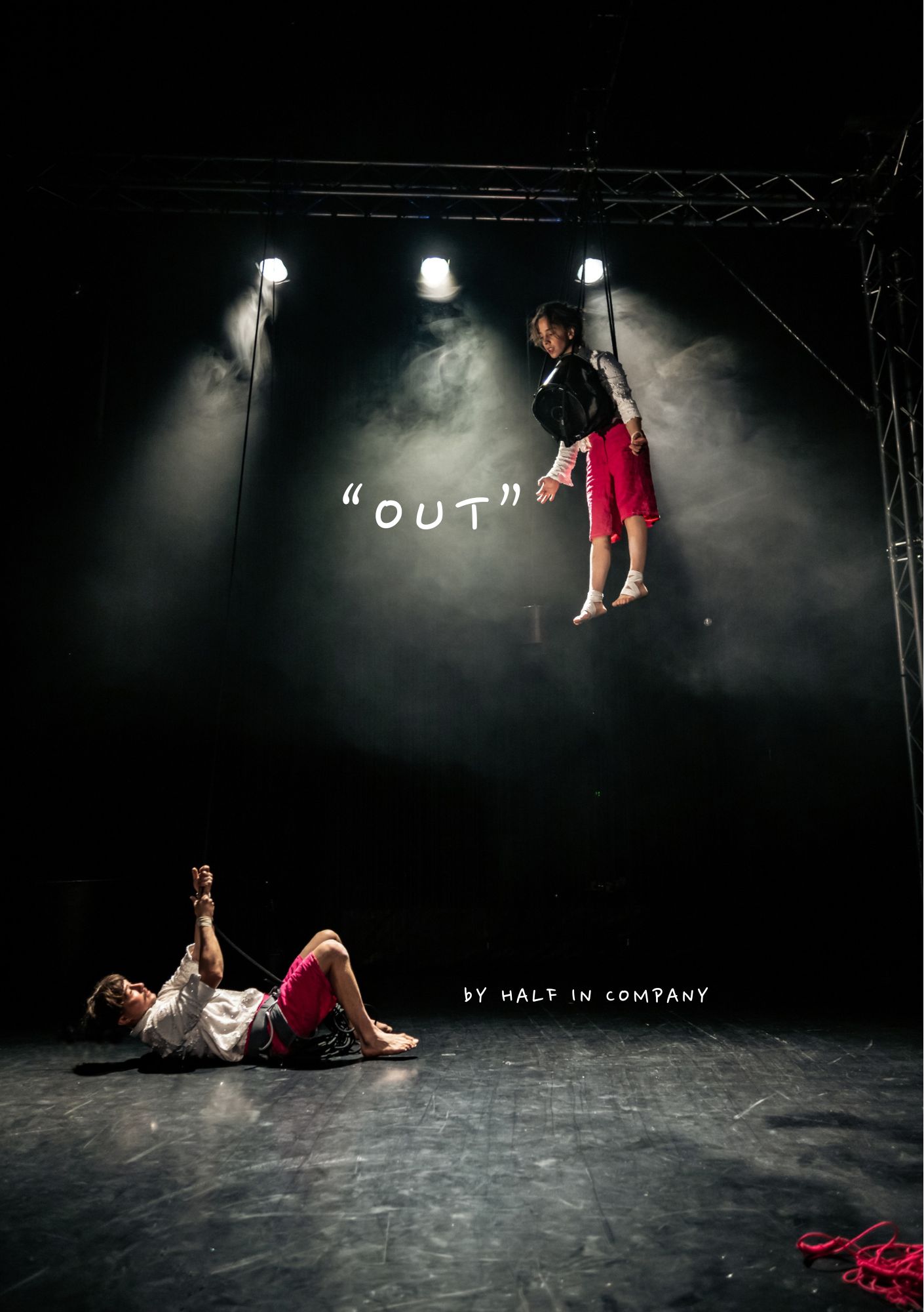 “O U T” est le titre de la première création de la compagnie Half In. Cette pièce a débuté en 2019 à Stockholm comme une rencontre entre deux personnes, un trapèze duo, des seaux et un espace. C’est un spectacle de 50 minutes, conçu pour l’intérieur. La première a eu lieu le 7 octobre 2024 avec Riksteatern à Umeå.
